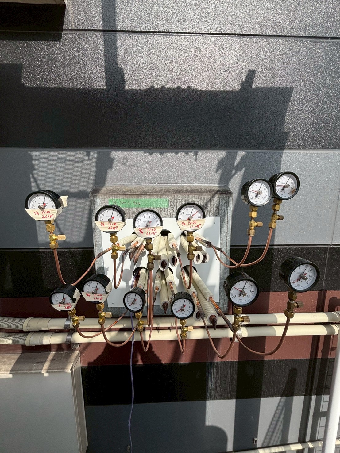 加古川市の大型テナント空調工事の現場では、冷媒配管工事がすべて完了し、現在は**耐圧検査(耐圧試験)**を実施しています。