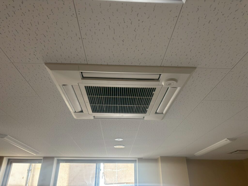 神戸市内の事務所新築工事にて、天井カセット形パッケージエアコン(通称:ビルマル)の設置工事を行いました。