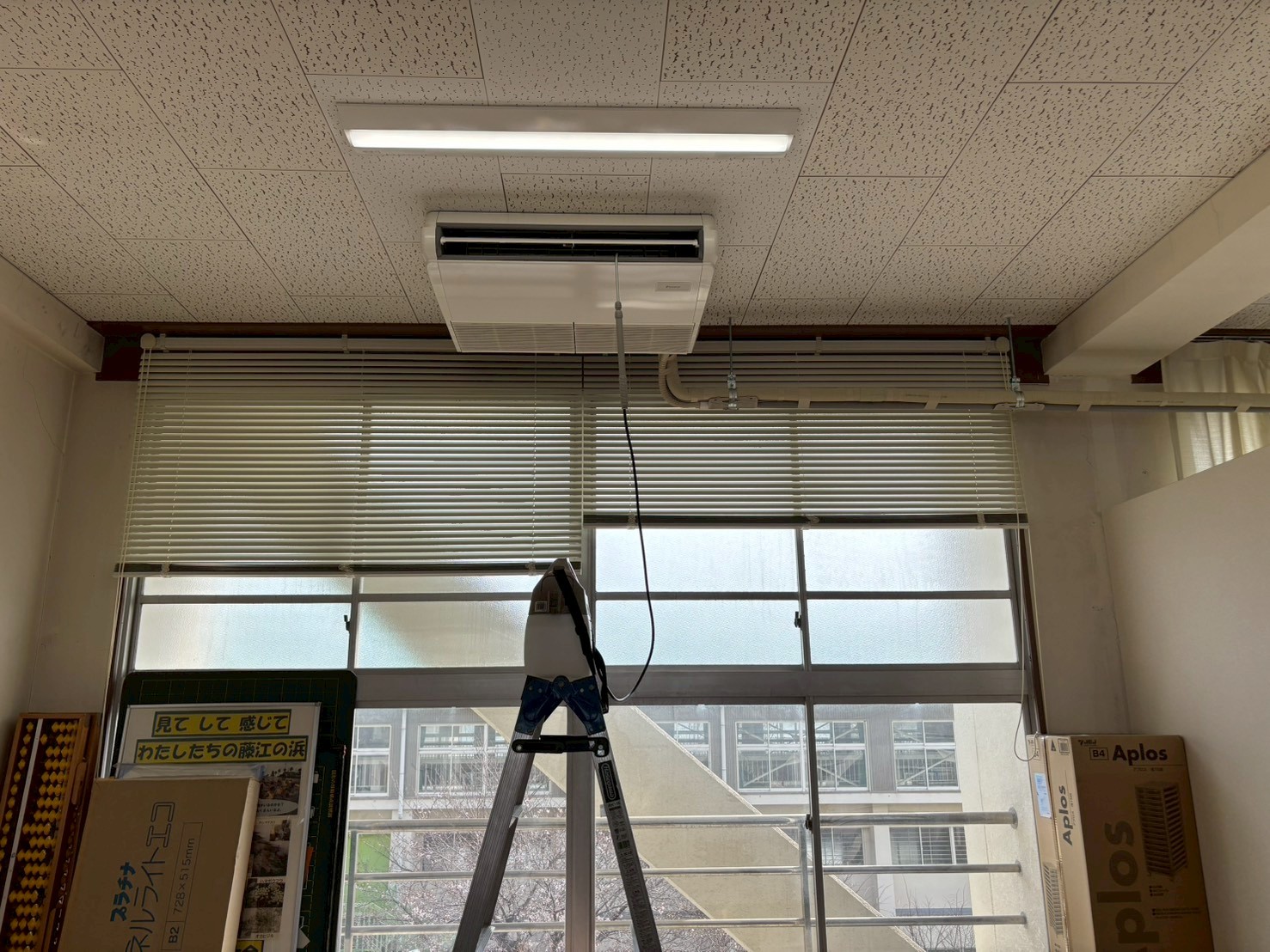 2026.03.26 明石市中学校 天吊りパッケージエアコン新設! 明石市の中学校に天吊りパッケージエアコンを新設|特別教室の快適性が大幅向上! こんにちは。今回は、兵庫県明石市にある中学校の特別教室にて、天吊りパッケージエアコン…